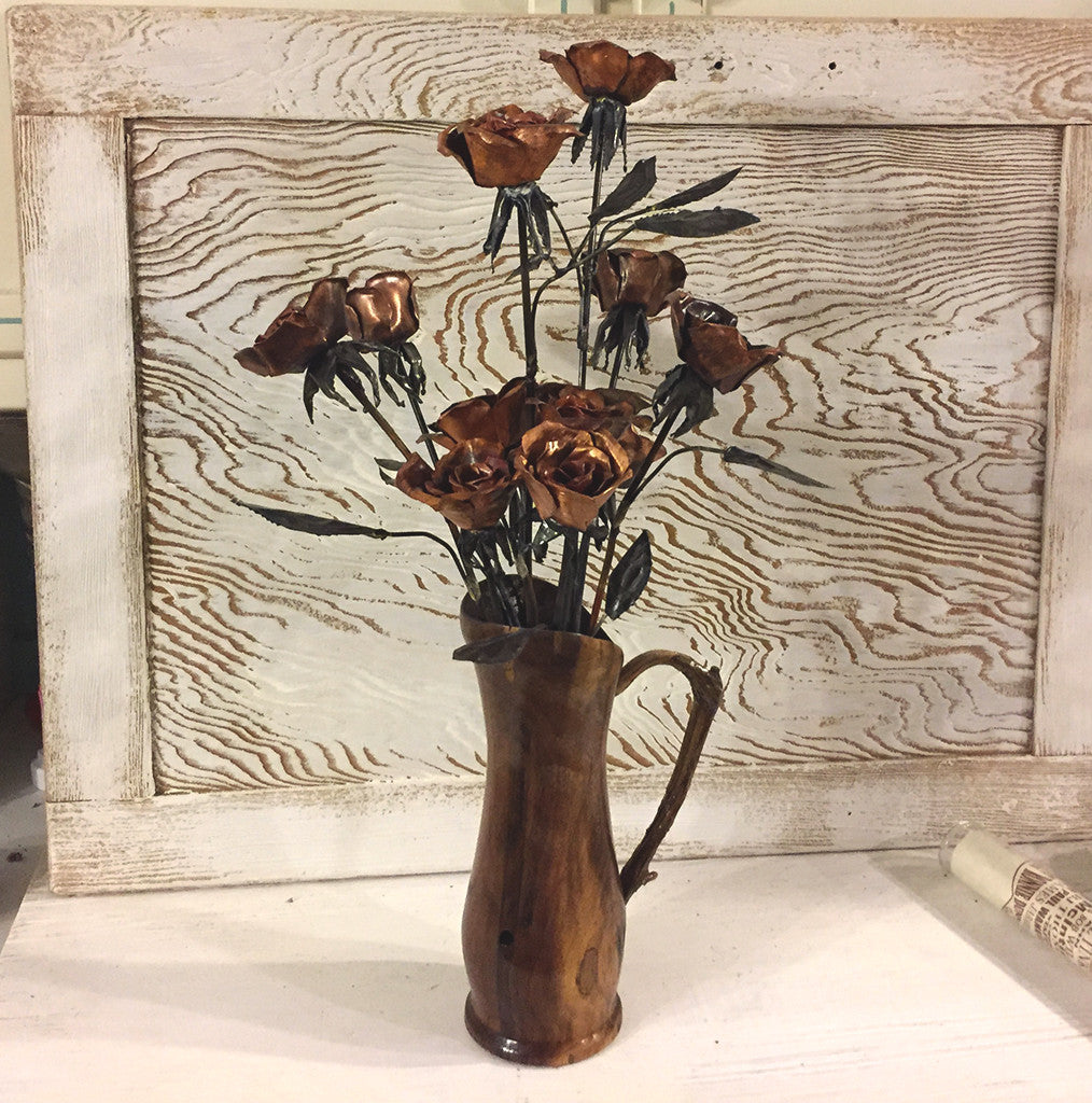 All hand crafted, formed forever lovely rose bouquet. An extraordinary gift for a life moment. So much exquisite detail even down to the thorns on the stems. Any place in your home will experience more elegance with the addition of our graceful bouquet. Perfect for 7th or 11th anniversary - with one extra rose for next year. Total of 12 roses. Vase is not included, flowers are lovingly hand formed from sheet copper. Please allow two weeks as these will be custom made for you!
