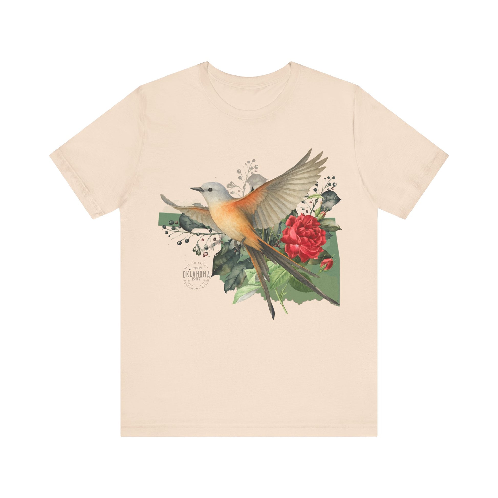 Unisex Jersey Short Sleeve Tee, perfect for those who appreciate style and comfort. Vibrant Scissor-tailed Flycatcher, mistletoe and rose graphic that adds a touch of Oklahoma's natural beauty to your look. Perfect dressed up and down, you'll feel at home in every occasion.